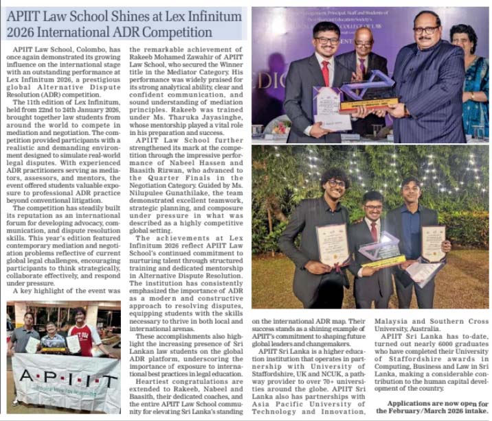 APIIT Law school shines at Lex Infinitum 2026 International ADR Competition